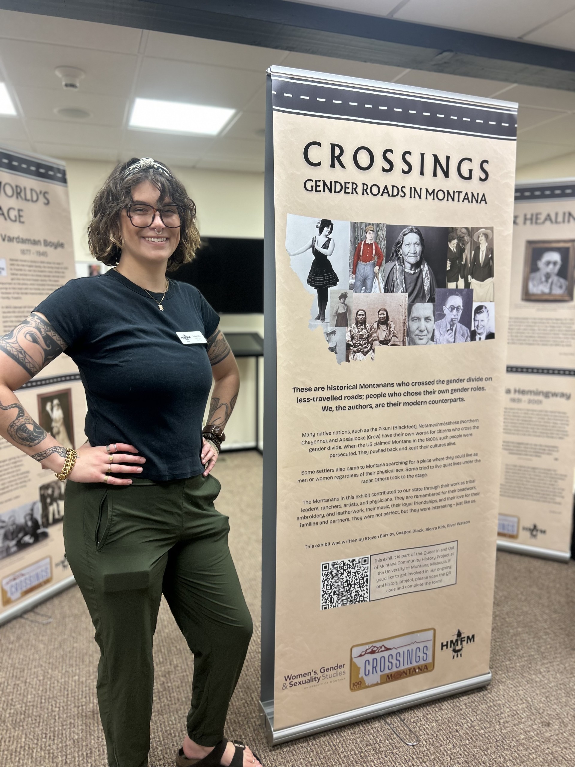 India Hite, a current History MA student, spent summer 2025 serving as an intern docent at the Historical Museum at Fort Missoula. Hite assisted with the “Crossings” exhibit, which told stories of gender intermediaries and trans history throughout Montana, but eventually expanded their work to include the other exhibits at the museum. Throughout the summer, Hite enjoyed talking with visitors about the exhibit and helping to create a welcoming space where people could learn about the topic and feel free to ask questions. Hite expanded visitors’ understanding of queer history in Missoula and the state while also taking time to do her own research and deepen her understanding of the topic. Hite was pleasantly surprised at how interested and open people were about the exhibit, and happy that she could help people think outside their comfort zone and understand a little more about queer history and the queer community.